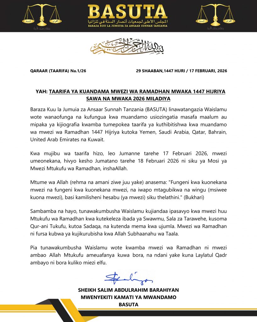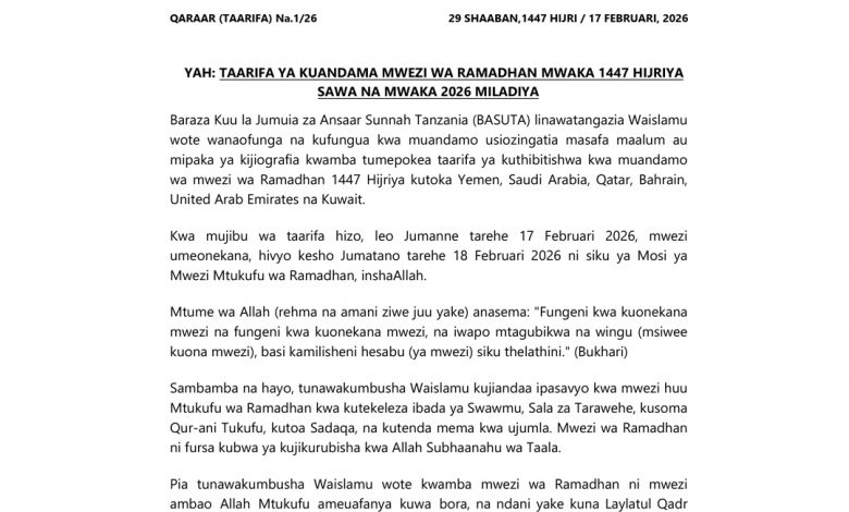 Home/Uncategorized/TAARIFA YA KUANDAMA KWA MWEZI WA RAMADHAN MWAKA 1447 HIJRIYA SAWA NA MWAKA 2026 MILADIYA Uncategorized TAARIFA YA KUANDAMA KWA MWEZI WA RAMADHAN MWAKA 1447 HIJRIYA SAWA NA MWAKA 2026 MILADIYA Abdulrahman Omary Ibrahim Send an email 0 15 Less than a minute Facebook X LinkedIn Tumblr Pinterest Reddit VKontakte Odnoklassniki Pocket Abdulrahman Omary Ibrahim Send an email 0 15 Less than a minute Facebook X LinkedIn Tumblr Pinterest Reddit VKontakte Odnoklassniki Pocket Share Facebook X LinkedIn Tumblr Pinterest Reddit VKontakte Odnoklassniki Pocket Share via Email Print